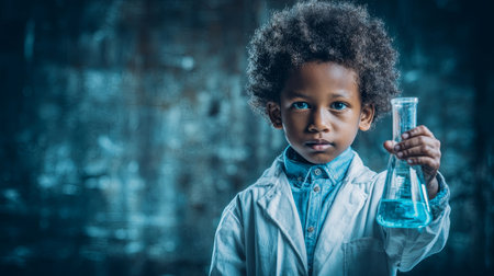 A young child in a laboratory coat proudly holds a flask filled with blue liquid, embodying curiosity and the spirit of scientific exploration in a modern educational setting.