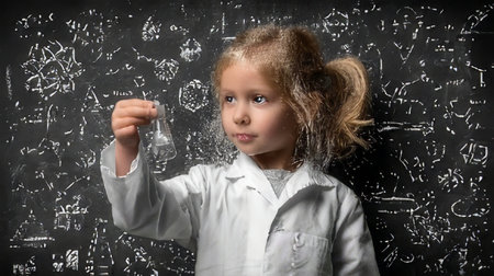 A young girl in a lab coat holds a flask, showcasing curiosity and wonder. The chalkboard background filled with science symbols highlights her engagement in learning and discovery.