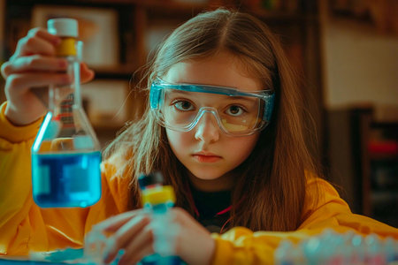 In a vibrant lab, a young girl wearing protective goggles carefully examines a blue liquid in a flask.