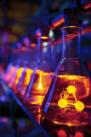 A chemical laboratory with glass beakers, test tubes, and a bubbling chemical reaction. High quality photo