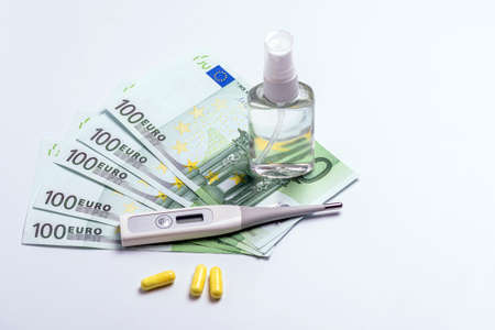 Close up woman disinfect money with antiseptic.