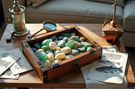 Rustic wooden box with colorful stones displayed on wooden table in nautical-themed setting. That the image is generated using AI.