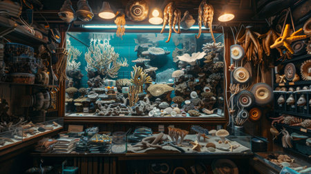An eclectic display of coral and seashells inside an aquarium-like setting, showcasing a rich variety of marine life and textures.