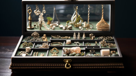 Discover a stunning array of beautifully crafted antique jewelry displayed in an artistic wooden chest, showcasing vibrant colors and intricate designs.