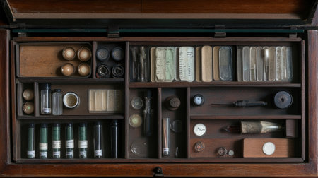 A vintage wooden medical kit featuring a variety of glass vials and instruments, perfect for collectors or historical exhibitions. Ideal for decoration.