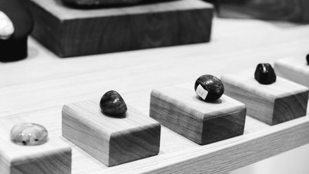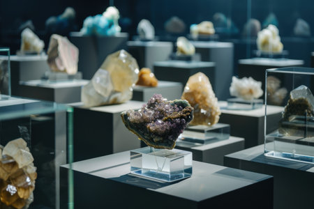 Rare earth mineral crystals are showcased on glass pedestals in a modern exhibition. the strategically arranged samples are illuminated by soft, focused lighting, their intricate structures and vibrant colors against a neutral background.