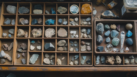 Explore a captivating assortment of minerals and crystals sorted in wooden trays, highlighting the diverse shapes and vibrant colors that celebrate nature's beauty and geological wonders.