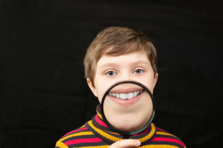 Little girl enlarged his mouth with an enlarged glass. Studio photo on a black isolated background.