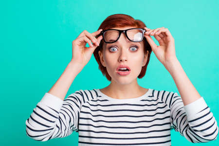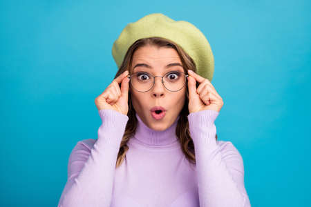 Oh no! Close up head shot photo portrait of confused speechless shocked pretty cute with big eyes she her people person look see watch at you camera adjust touch specs isolated vivid background