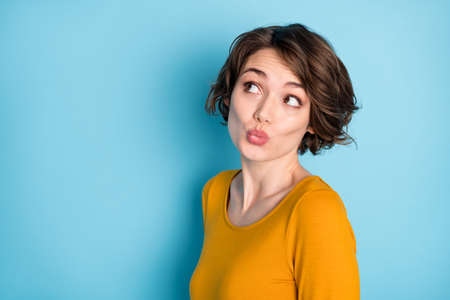 Portrait of nice pretty brunette lady look empty space wear yellow shirt isolated in vivid blue color background