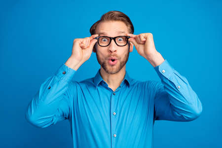 Portrait of astonished girl cant believe incredible wonderful ads touch modern specs wear good look clothes isolated over blue color background