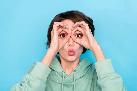 Photo of funky funny lady dressed green pullover showing arms spectacles cover eyes isolated blue color background