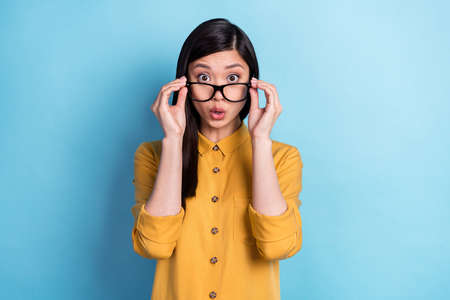 Photo of young asian girl amazed shocked surprised fake news hands touch glasses isolated over blue color background
