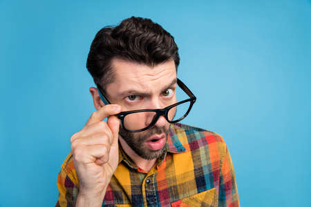 Photo of suspicious questioned handsome guy dressed plaid shirt arm touching eyeglasses unexpected news isolated on blue color background