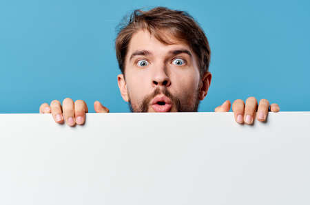 Surprised man bulging eyes on blue banner with place for text. Exophthalmos with hyperthyroidism or surprise in advertising due to discounts, sales in the store.