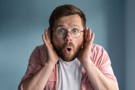 Man with glasses eavesdrops with his hands to ears, he opened mouth in shock and looks with big eyes.
