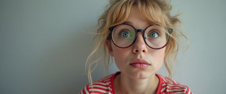 A young woman wearing round glasses, looking surprised and confused while staring forward indoors.