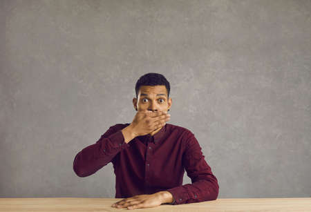 Young african american business man sitting in the office and looking at the camera in shock, covering his mouth with his hand. Sits on a gray background, close up. Guy covers his mouth with his hand