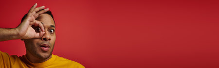amazed indian man in yellow t-shirt showing okay sign, hand near face background in studio, banner