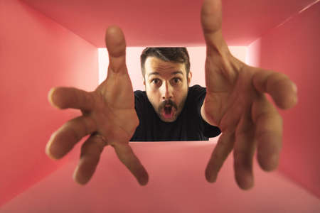 Emotive man looking inside carton box with hands, shocked face. Delivery service. Black Friday sales. Concept of gifts, shopping, emotions, facial expression. Unpacking box.