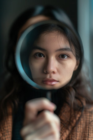 Distorted self perception or image concept. Woman face inverted at magnifying glass. Psychology problems and poor, unstable sense of who you are. High quality photo
