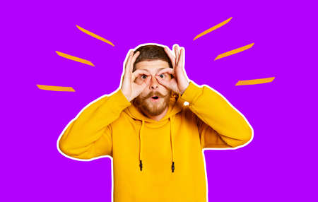 Art collage with young crazy man in yellow hoodie making face, having fun isolated on bright purple background. Concept of human emotions, facial expression, sales, ad