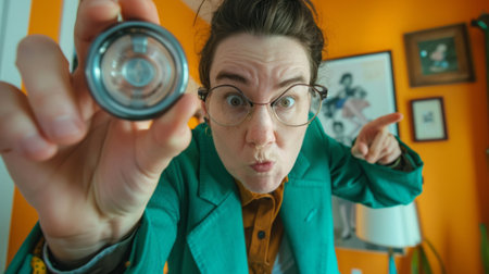 Curious woman in green jacket holding lens in colorful room.