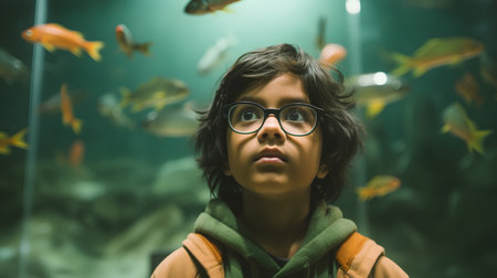 Portrait of a boy in the aquarium with fishes. Shallow depth of field.