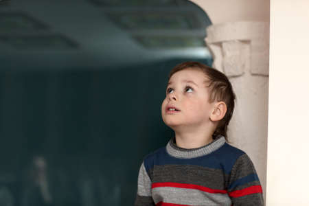 Teenager boy getting ideas and day dreaming. Half portrait of teenager looking up to copy space.