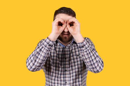 Man with beard smiling, making binoculars with his hands, isolated on orange background. Looking at camera.