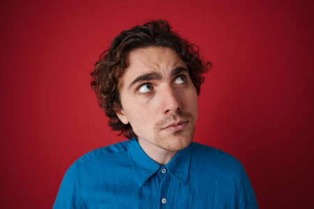 Brooding handsome man thinking and looking aside isolated over red background