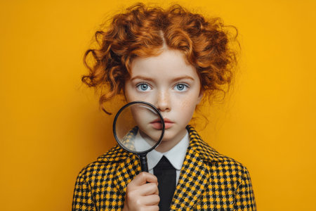 Red-haired little girl with a magnifying glass on a yellow background. Children play detectives and spies.
