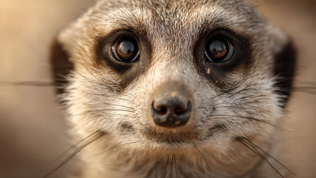 Detailed portrait of a meerkat looking directly at the camera, showcasing its distinctive facial features and curious expression.