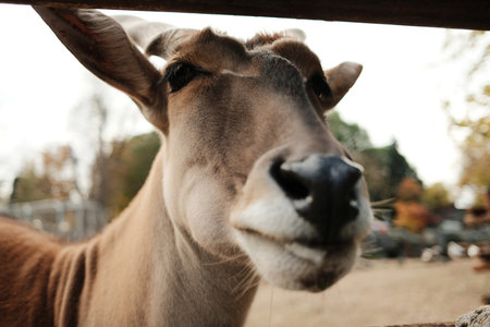Detailed view of an antelopes face behind a wooden fence at Belgrade Zoo in autumn. Soft focus and natural light