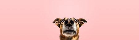 Portrait of a funny dog on a colored background using a wide-angle lens. Copy space. Generative AI.