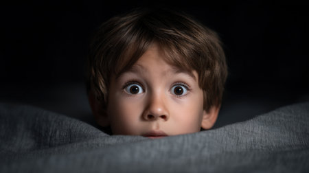 A young boy peeks from under a blanket, his wide eyes full of surprise and fear. Captured in a dark room, this image reflects childhood vulnerability and emotion.