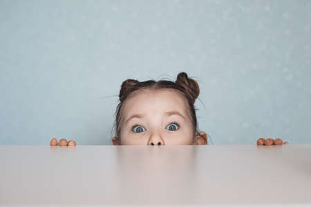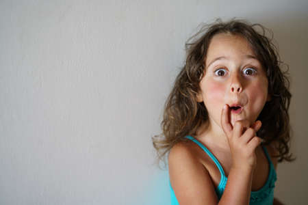 Startledtoddlergirlgazesintothecamerahandshoveringnearheropenmouth. Concept Toddler, Girl, Started, Gaze, Camera