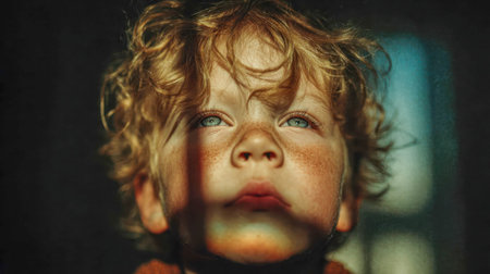 Young boy gazing upward through shadows, face partially illuminated, conveying curiosity and mystery.