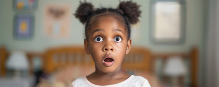 Startled AfricanAmerican girls adorable portrait captured in her room displaying surprise. Concept Surprise Portrait, African American Girl, Bedroom Setting