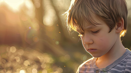 A young boy looks up with a curious expression, surrounded by nature, captured in soft, warm lighting with dreamy tones.
