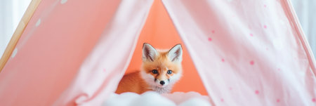 A little fox curiously peers out from a pastel tent, surrounded by a cozy playroom atmosphere that is warm and inviting, perfect for playful adventures.