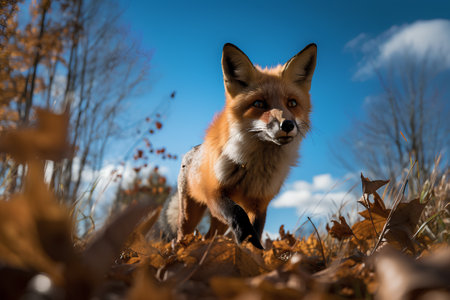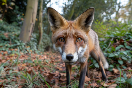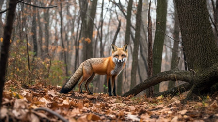 A fox stands amidst a forest floor carpeted with fallen leaves during autumn. The image showcases warm, orange hues and soft lighting. The composition is centered, creating a focused view of the animal. This imagery is suitable for various editorial and commercial projects.