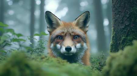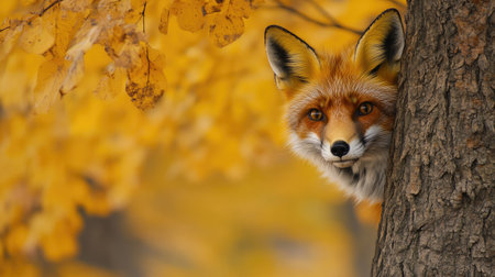 A close-up of a red fox peering out from behind a tree, its fur blending into the autumn foliage, symbolizing the cunning and adaptability of this animal.