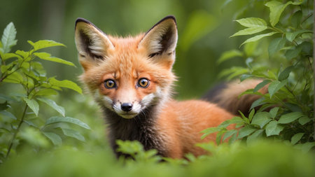 An AI generated illustration of an adorable and endearing baby fox in his natural habitats