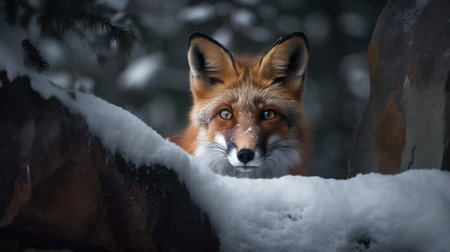 Fluffy fox in winter forest, alert and staring at camera generated by artificial intelligence
