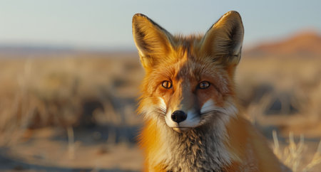 A close-up photograph of a red fox in a desert environment, looking directly at the camera.