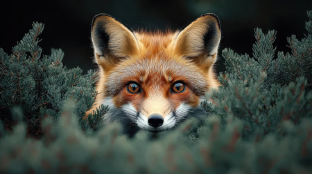 A close-up of a fox peering through foliage, showcasing its striking orange fur and intelligent eyes, set against a dark, natural background.