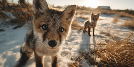 Two adorable fox kits explore their snowy surroundings in a serene winter landscape filled with sunlight. Their curious expressions capture a moment of innocence and playfulness in nature.