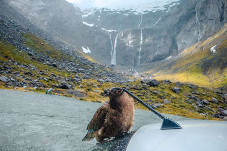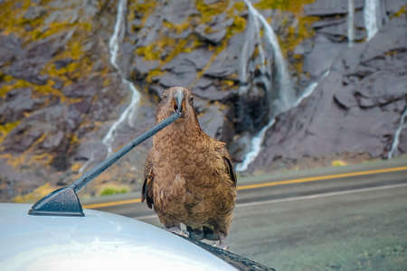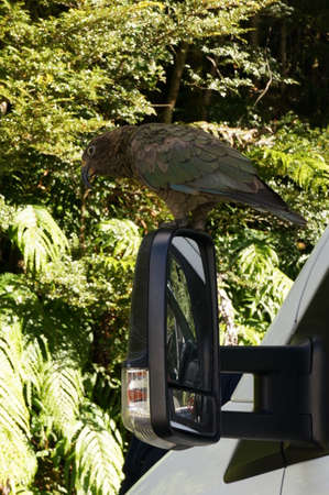 Kea Parrot landed on tourist's car at Fiordland National Park, New Zealand