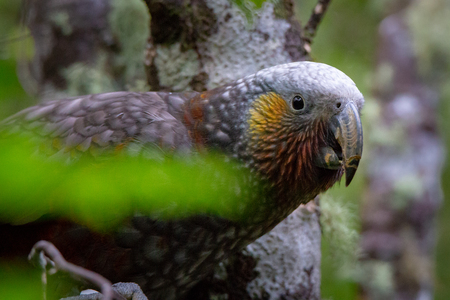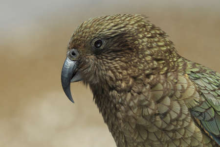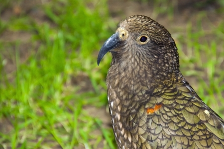 The very rare Kea alpine parrot bird from new zealand. Kea birds are in decline and are classes as a vulnerable species. New zealand parrot.